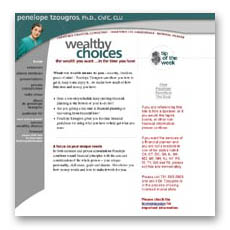 The Wealthy Choices site includes ecommerce and a wealth of information. The design fits a financial consultant but stands out from the competition. The design also coordinates with her book and speaker kits for a unified look.